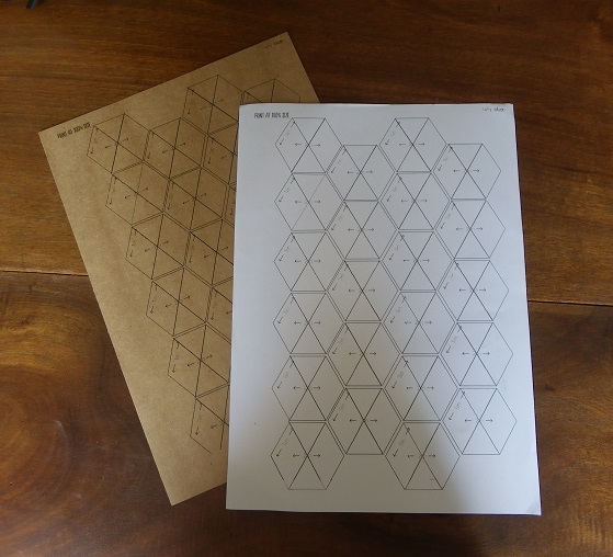 Outre les explications, Jodi vend également les gabarits, mais je rechigne à faire faire vingt mille kilomètres d’avion à des petits bouts de carton. Alors je les dessine moi-même. Les formes paraissent complexes, mais ne sont en réalité que des variations autour des hexagones.