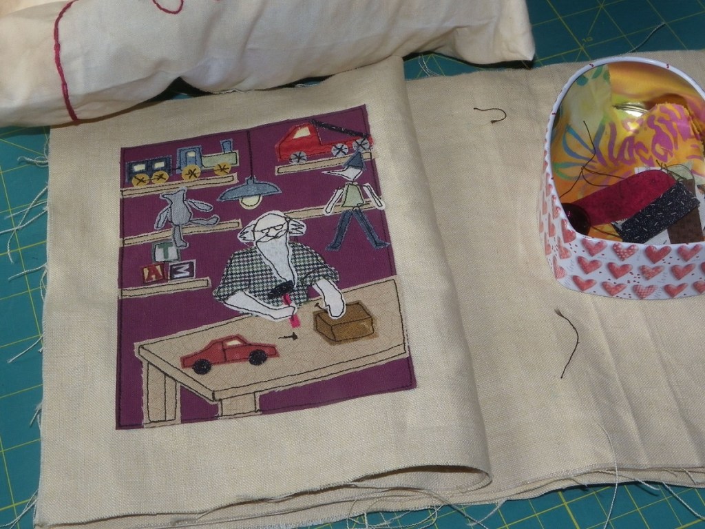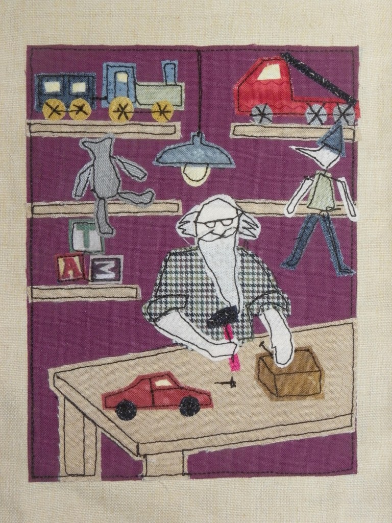 En ce qui concerne le livre textile Le Village du Père Noël, Roxane nous proposait pour ce mois d’août de visiter l’atelier de Santa Claus. Le modèle original contient une foultitude de jouets sur les étagères et des outils en pagaille sur l’établi. Impossible de tricher avec un tissu à motifs comme pour la cuisine, je n’avais pas d’imprimé ad hoc sous la main. Alors j’ai une fois encore un peu épuré le dessin.
