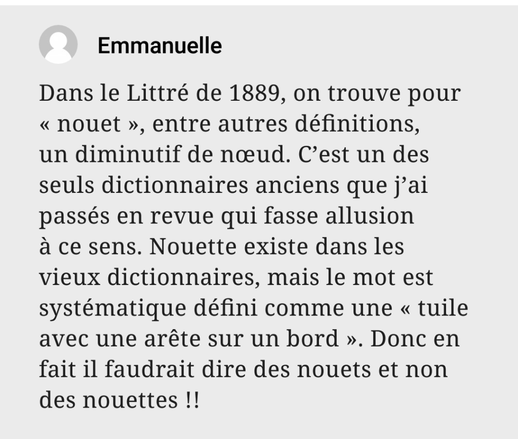 Dans le Littré de 1889, on trouve pour « nouet », entre autres définitions, un diminutif de nœud. C’est un des seuls dictionnaires anciens que j’ai passés en revue qui fasse allusion à ce sens. Nouette existe dans les vieux dictionnaires, mais le mot est systématique défini comme une « tuile avec une arête sur un bord ». Donc en fait il faudrait dire des nouets et non des nouettes !!