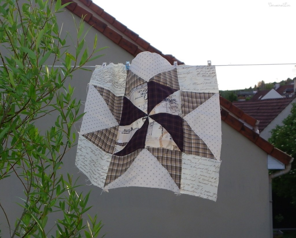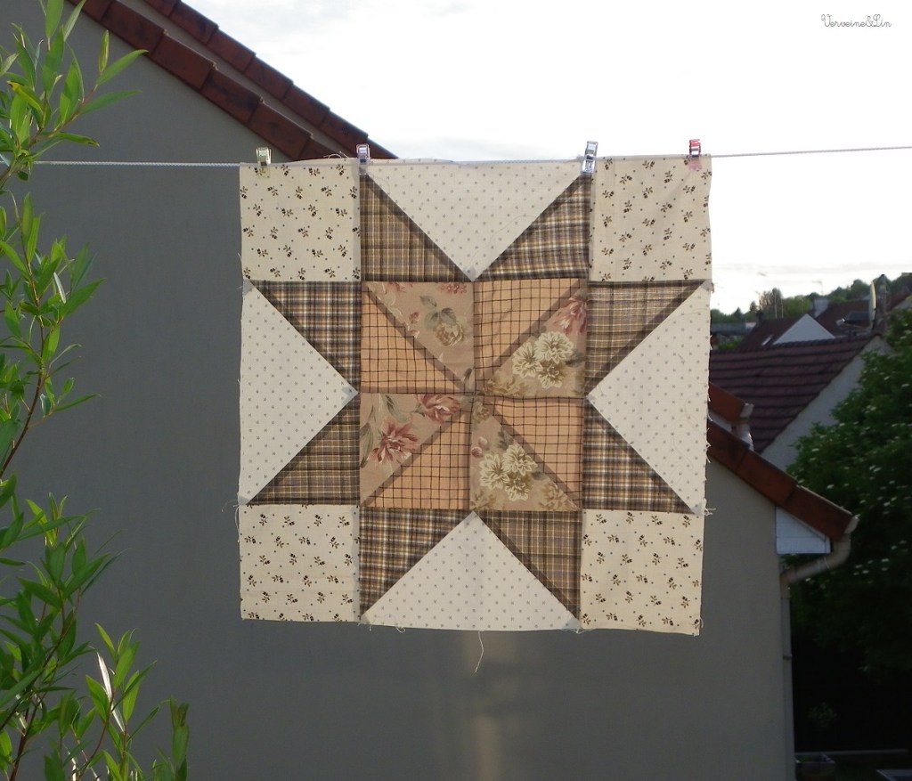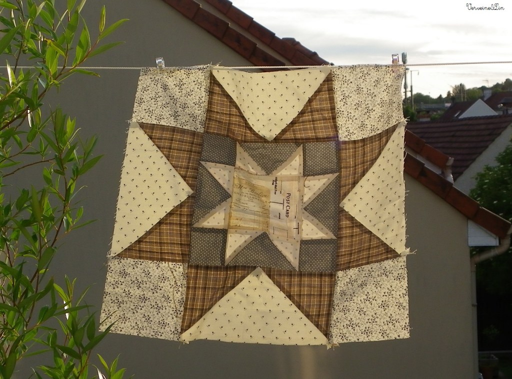 Avril arrive, et avec lui le quatrième bloc : Eight Hands Around. Une petite étoile est incluse dans le carré central. C’est déjà plus à mon goût, à l’exception du motif secondaire induit par les triangles dans les carrés d’angle. #jamaiscontente