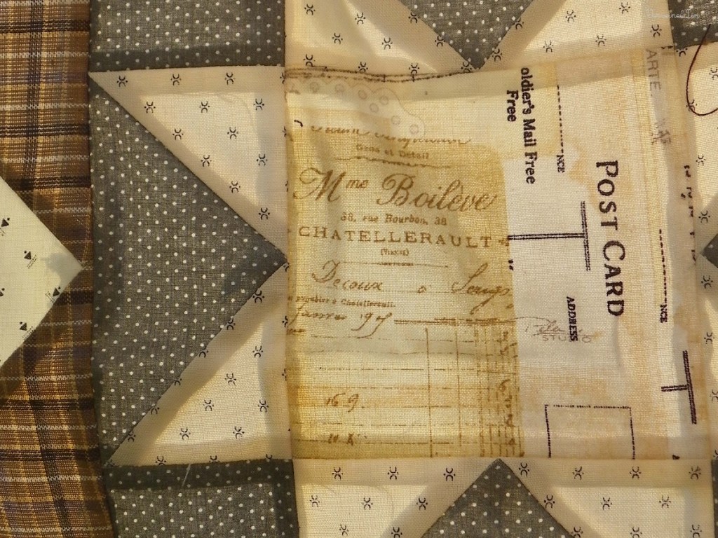5. En fait, j’ai aussi abandonné tout ce qui était proposé en « mystère » que ce soit broderie ou patch. Continue à faire comme tu le sens et ce sera TON patch. Et je t’avoue que ton tissu écriture me parle aussi, car le nom de famille inscrit (en dessous de Chatellerault) est le même que celui de…… mon grand-père maternel !!!! Allez, bonne continuation, bisous