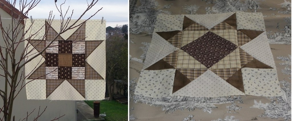 Voici le résultat en tissu pour l’étoile de mars. J’ai alterné les écossais des pointes, c’est ma seule concession au modèle de départ – mais ça ne se voit pas beaucoup sur la photo. Sinon, j’ai repris la construction des blocs de janvier et février.