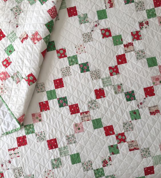 La Chaîne Irlandaise – Irish Chain – est un modèle très versatile. Version monochrome, couleurs de Noël, arc-en-ciel ou joyeux fouillis de couleurs, tout lui va. On trouve de nombreux tutoriels pour réaliser cette courtepointe, généralement à la machine et à partir de bandes de tissu. Elle est également très facile à coudre à la main, puisque ce ne sont que des carrés.