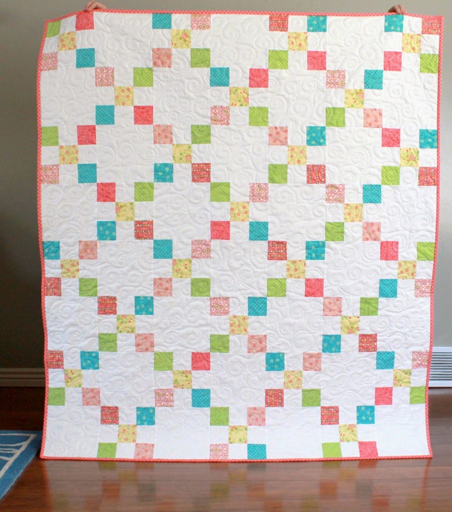 J’ai personnellement une préférence marquée pour la simple irish chain. Cette interprétation au design plus épuré cumule tout ce que j’aime dans le patchwork. Une grande simplicité dans la conception, et pourtant un bel impact visuel. Des petits carrés imprimés et neutres sont disposés en blocs de neuf ou nine-patch, puis alternés avec des carrés neutres plus grands. La disposition crée des lignes diagonales comme un treillage, et de vastes espaces neutres laissent la part belle au quilting.