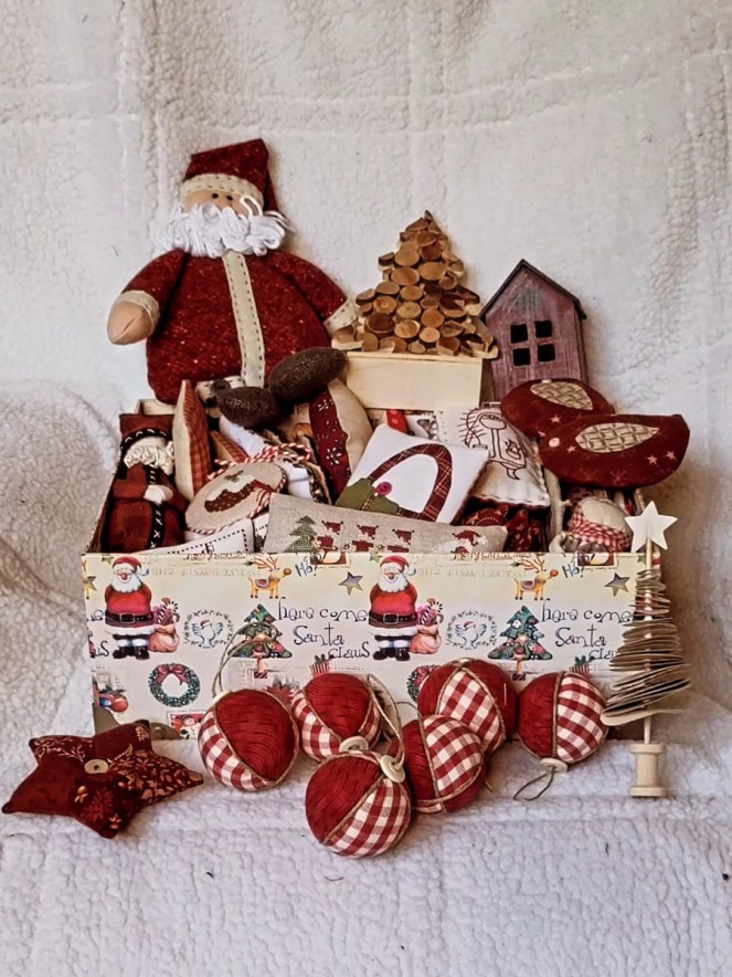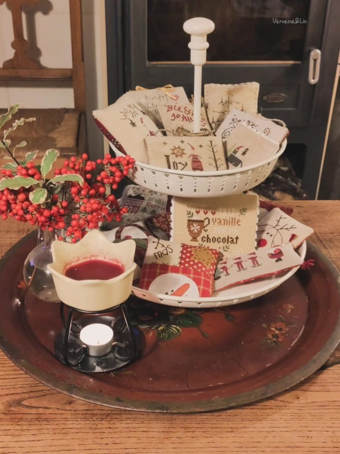 J’ai juste installé sur la table basse ce petit assortiment des broderies et autres créations de Noël réalisées au fil des années.
