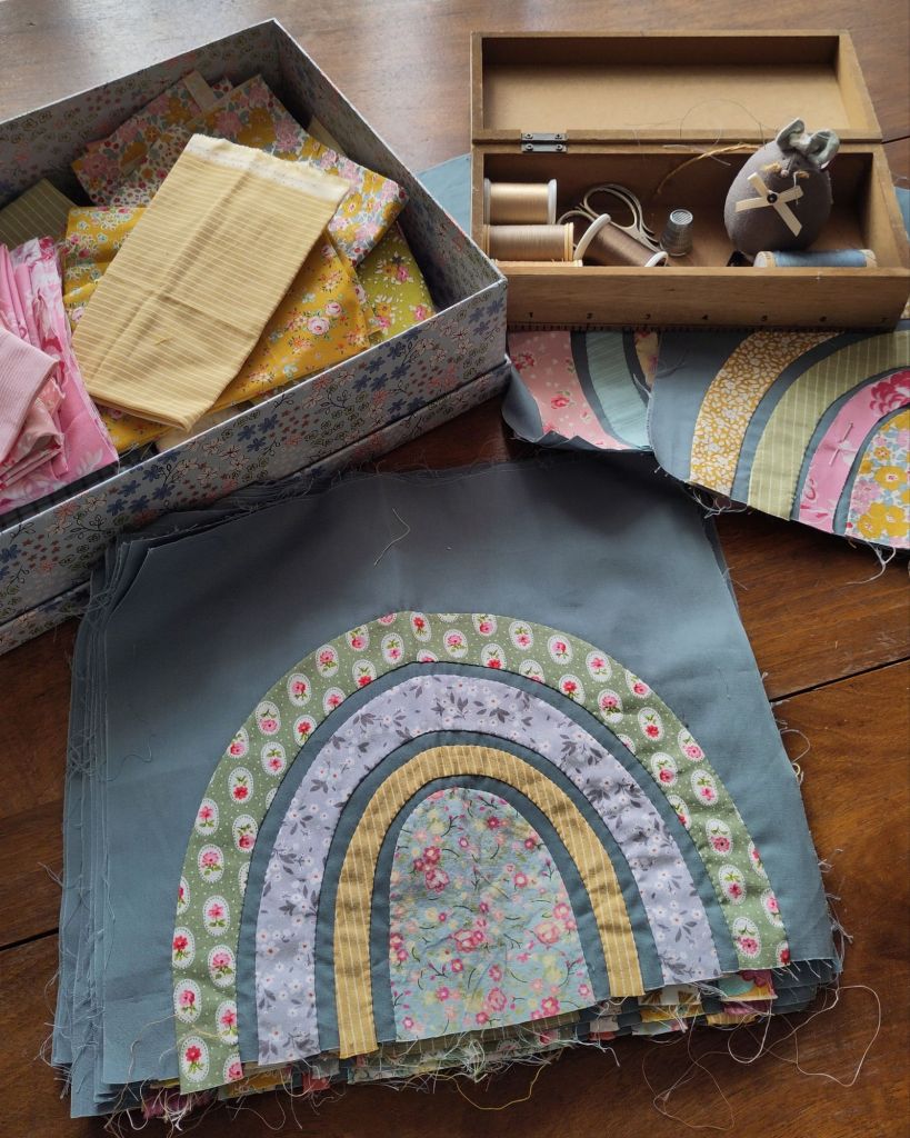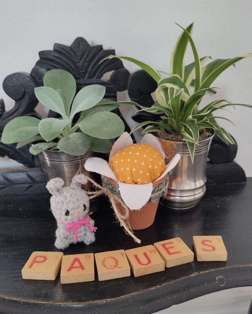 Le pique épingles ensoleillé et ton adorable petit lapin sont les décorations parfaites ! Un peu de soleil, un joli nouveau projet qui fait redécouvrir de beaux tissus, tu as tout pour reprendre doucement le quilting. Bon courage, et gros bisous.