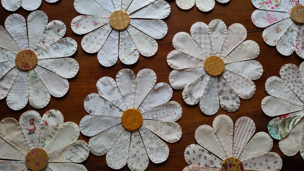 Allez, les vacances sont terminées. De train en ferry, les cent quarante-quatre pétales ont été bâtis, Avec même parfois un petit coup de main de patte de la part de Bibi-la-timide et de Lulu-la-fouineuse, nos colocataires A!rBnB. Puis j'ai joué avec mes tissus imprimés. Enfin, une fois la disposition validée, les pétales sont assemblés à… Lire la suite Marguerites